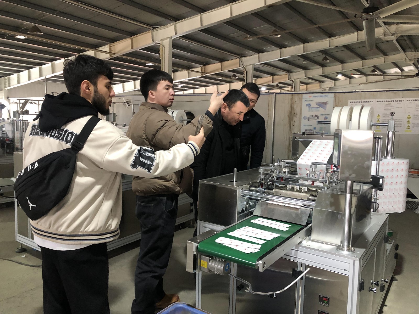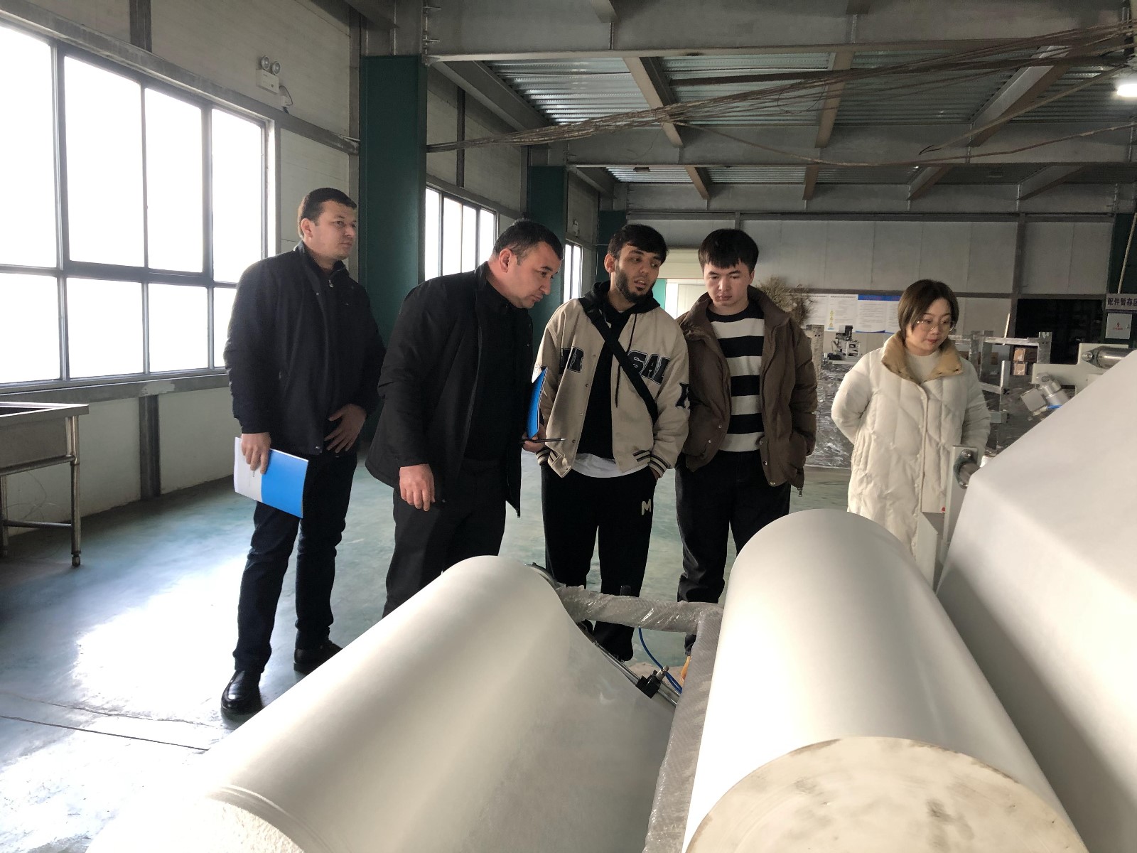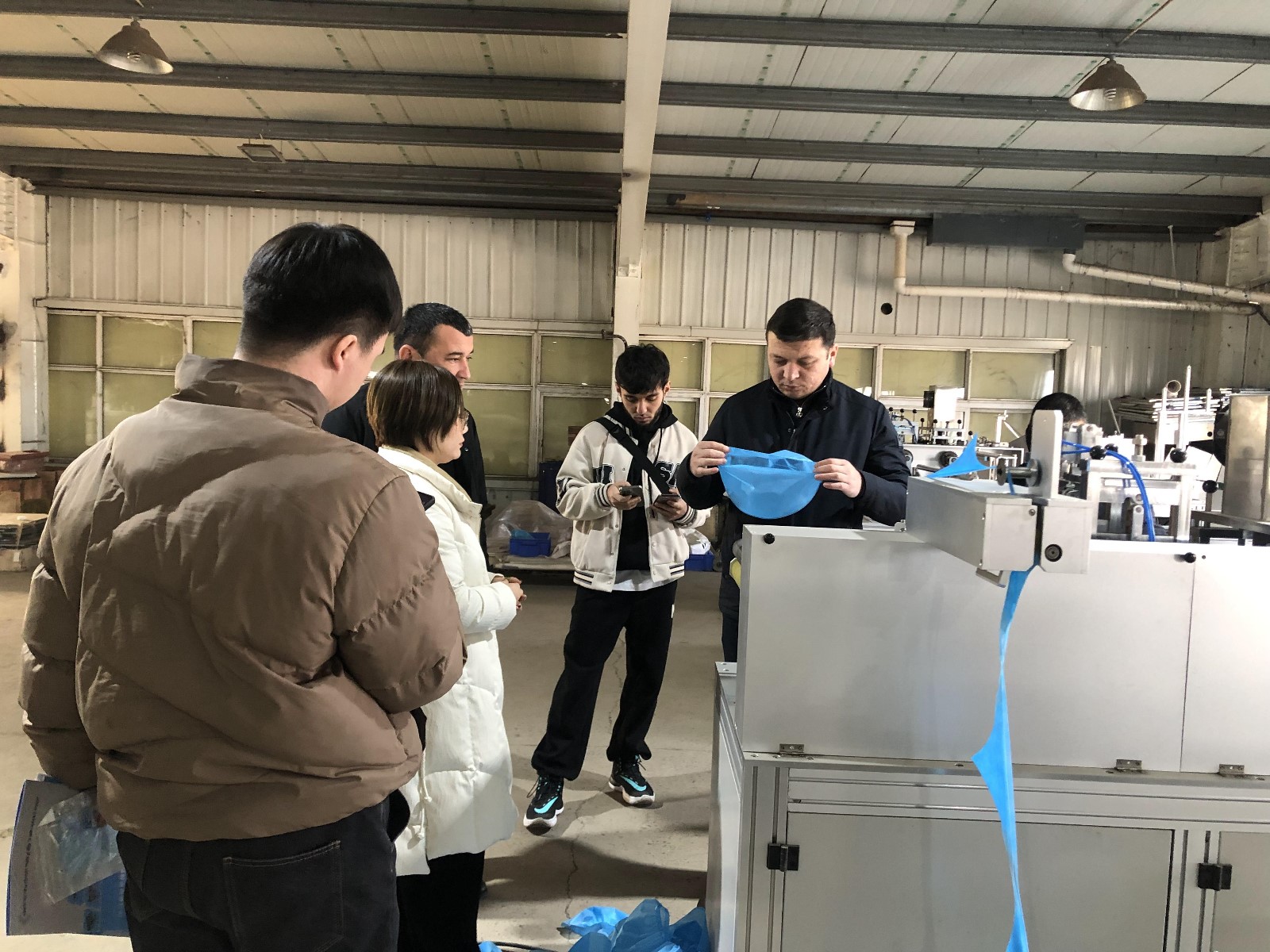 烏斯別克斯坦客戶一行對我公司邦恩進行實地考察,對酒精棉片車間、包紙繃帶打卷機車間、手術(shù)帽車間和消毒柜現(xiàn)場進行了參觀。